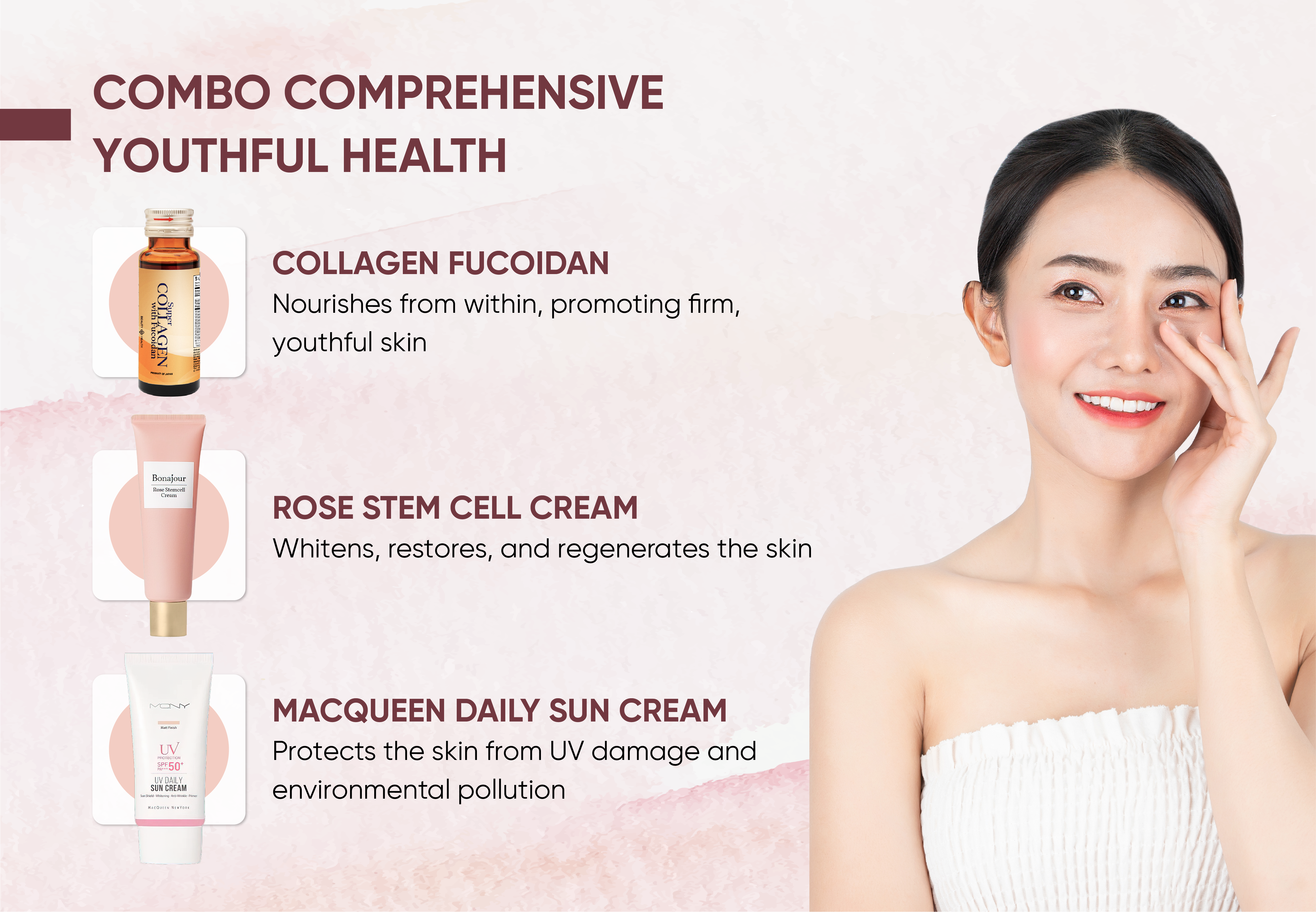 Beautiful skin requires not only external care but also nourishment from within. Many women focus on just one aspect without truly taking comprehensive care of their skin. Understanding this, Tina Horizon introduces Combo COMPREHENSIVE YOUTHFUL HEALTH, which combines Collagen Fucoidan for internal nourishment, Rose Stem Cell Cream for skin regeneration and Sunscreen to protect against environmental damage. This powerful trio helps maintain healthy, smooth, and youthful skin for the long term. So why is comprehensive skincare so important? Let’s find out!