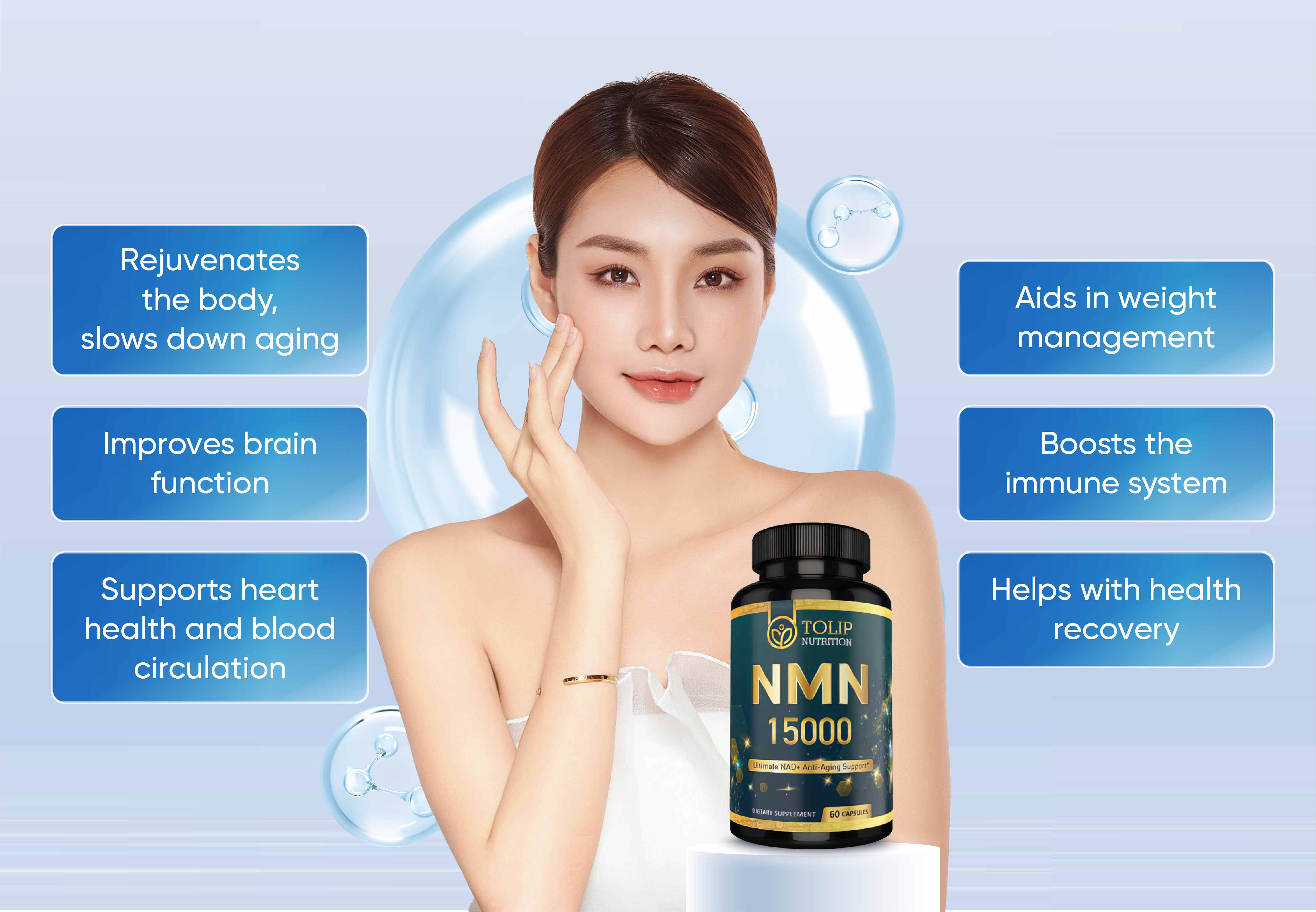 In today's fast-paced world, maintaining health and beauty is a top priority. NMN 15000, a groundbreaking nutrient in anti-aging science, offers remarkable benefits for improving health, rejuvenating the skin and boosting energy. Let’s explore the incredible advantages that NMN 15000 brings!