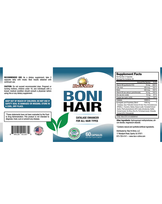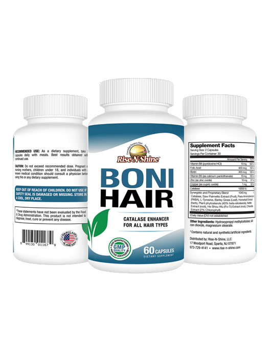 BoniHair - Catalase Enhancer - Direct From Manufacturer! BoniHair contains 10,000 units of the enzyme Catalase, including herbal extracts along with Saw Palmetto, Biotin, Fo-Ti, PABA, and many more powerful nutrients! Our Catalase Enhancer is one of the strongest formulas on the market! Boni Hair is a supplement that is intended to provide the body with more Catalase. Boni Hair is intended to replenish the enzyme Catalase that slowly depletes as we age. Hydrogen Peroxide is also naturally produced by the body. When catalase levels decline, naturally occurring hydrogen peroxide cannot be broken down which allows hair to be bleached from the inside out. The Catalase enzyme catalyzes the decomposition of Hydrogen Peroxide to water and oxygen. Made with 10,000 IU of the Catalase, Biotin, Vitamin B6, Folate, Calcium, Zinc, Copper, Maganese, Horsetail, Saw Palmetto, PABA, l-tyrosine, Plant Sterols, Nettle Root Extract, Chlorophyll, Fo-Ti, Barley Grass, and more!