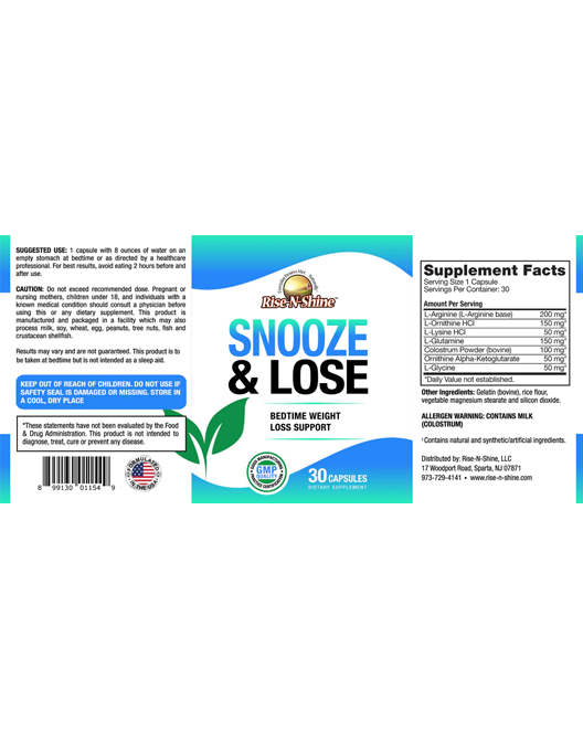 Snooze & Lose bedtime diet formula is specially formulated with key ingredients to promote weight loss during the sleep cycle. Proper rest is essential for a person's ability to maintain healthy body weight. Yet when a person sleeps, their ability to burn calories is typically diminished. Snooze & Lose is formulated with ingredients that help to support weight loss, but will not interrupt the important sleep cycle necessary to weight loss. I